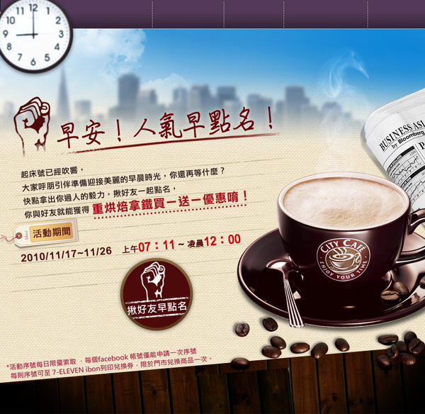 - 成為7-ELEVEN粉絲,參加人氣早點名活動,邀請5位好友參與早點名活動,只要有任一好友成功在活動期間內完成早點名,邀請者與成功完成點名之好友即可獲得CITY CAFÉ 重烘焙拿鐵買一送一兌換序號一組。被邀請參與點名的粉絲,只要當天序號發完前報到也可獲得CITY CAFÉ 重烘焙拿鐵買一送一兌換序號一組。每位7-ELEVEN粉絲限領取一組活動序號。